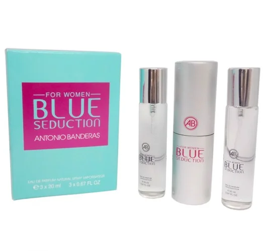 Antonio Banderas Blue Seduction For Women, edp., 3*20 ml — набор цветочных-фруктовых духов с нотами черной смородины, водяными, ландыша и бергамота. Заключительное трио — мускус, амбра и лист пачули.